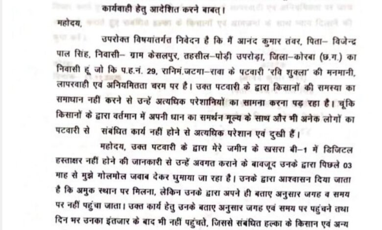 कोरबा :- पोड़ी-उपरोड़ा तहसील के ग्राम रा.नि.मं. जटगा रावा हल्का क्षेत्र में पदस्थ पटवारी रवि शुक्ला की मनमानी, लापरवाही और रिश्वतखोरी से ग्रामीण किसान त्रस्त हैं। हालात यह हैं कि ग्राम केसलपुर निवासी किसान आनंद कुमार तंवर पिछले तीन महीने से अपनी जमीन से जुड़ी साधारण प्रक्रिया के लिए चक्कर काटते-काटते थक चुके हैं, लेकिन पटवारी ने अब तक कार्य पूरा नहीं किया।