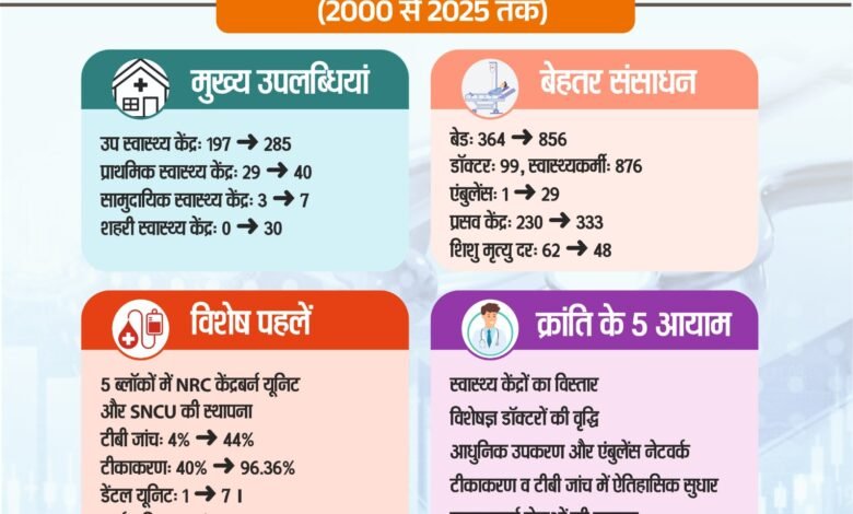 स्वास्थ्य केंद्रों और अस्पतालों का निरंतर विस्तार, विशेषज्ञ डॉक्टरों और स्वास्थ्यकर्मियों की संख्या में वृद्धि, अत्याधुनिक चिकित्सा उपकरण और एंबुलेंस नेटवर्क का सुदृढ़ीकरण, टीकाकरण, टीबी जांच और प्रसव सुविधाओं में ऐतिहासिक सुधार और राज्य स्तरीय पुरस्कार एवं एनक्यूएएस (राष्ट्रीय गुणवत्ता आश्वासन मानक) प्रमाणन के साथ गुणवत्तापूर्ण सेवाओं की पहचान है।